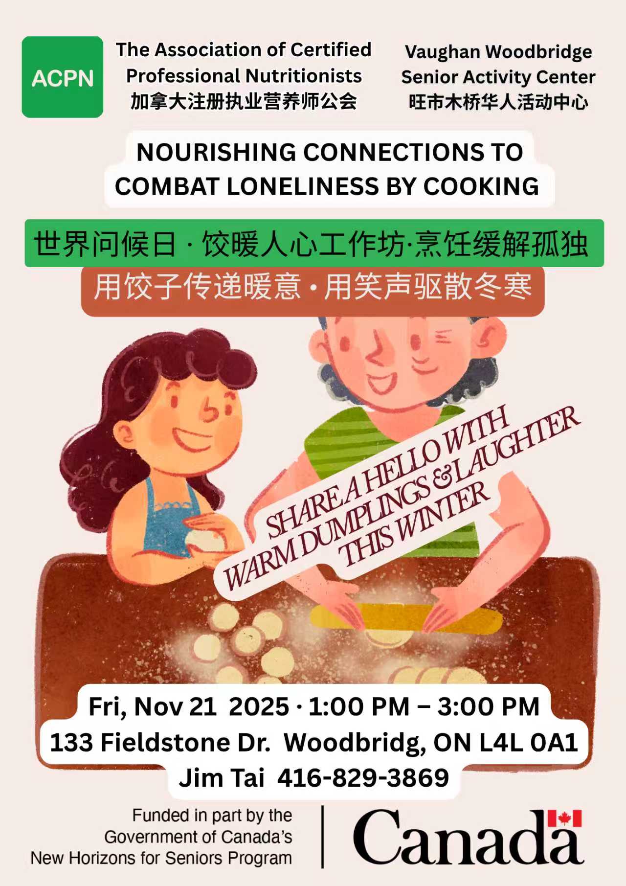 The Association of Certified Professional Nutritionists (ACPN) is delighted to present another session of our Nourishing Connections to Combat Loneliness by Cooking series. This heartwarming dumpling-making workshop invites seniors and community members to come together, share stories, and build meaningful connections while cooking. Participants will learn how to prepare traditional dumplings, explore the cultural significance of food in fostering emotional wellness, and enjoy a joyful afternoon filled with laughter, warmth, and delicious flavours.