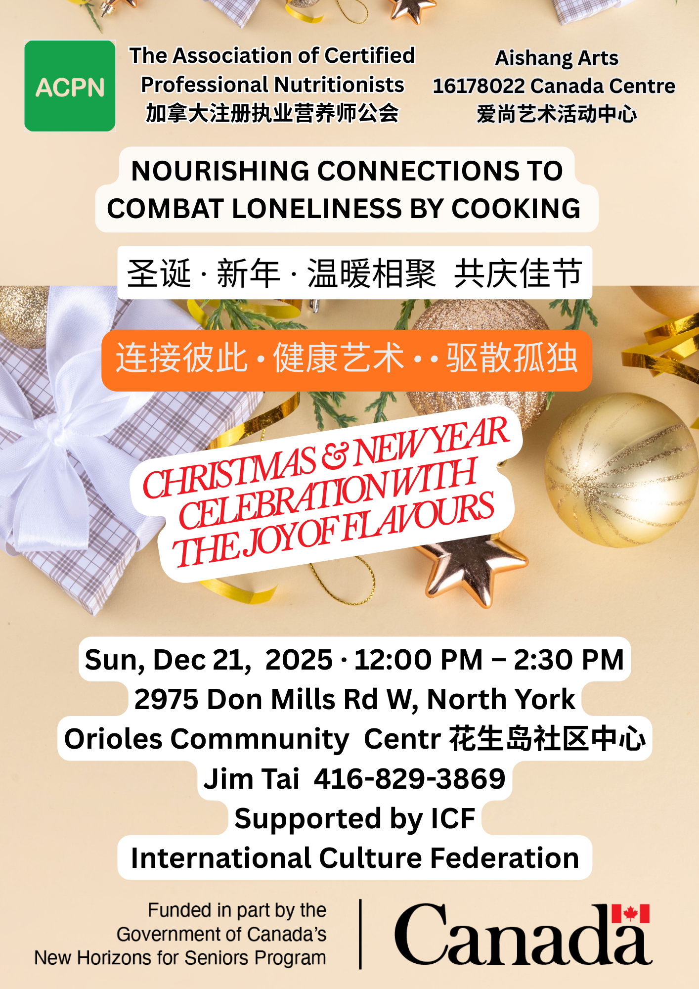 This joyful community gathering was part of ACPN’s ongoing initiative, “Nourishing Connections to Combat Loneliness by Cooking,” funded in part by the Government of Canada’s New Horizons for Seniors Program. The event brought together seniors, families, and community members to celebrate the holiday season through food, culture, and meaningful social connection.